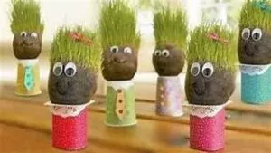 muñecos de aserrín que les crece pasto, les encantaran, incluso, puedes elaborarlos junto con ellos.
